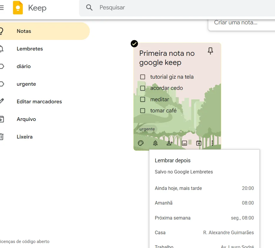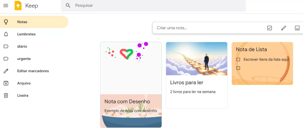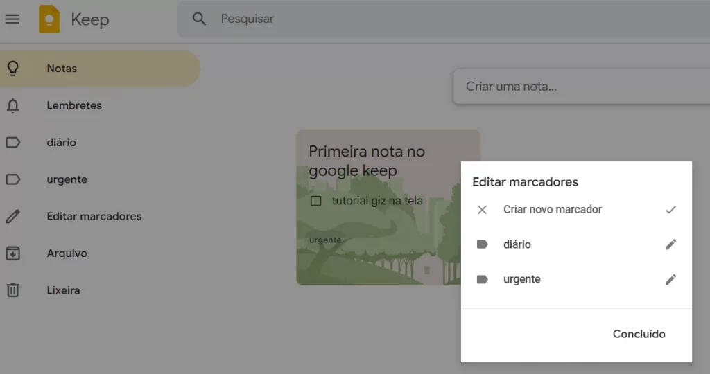 • Marcadores: Depois de criados os marcadores aparecem listados na coluna esquerda do Google Keep, com o símbolo de tags